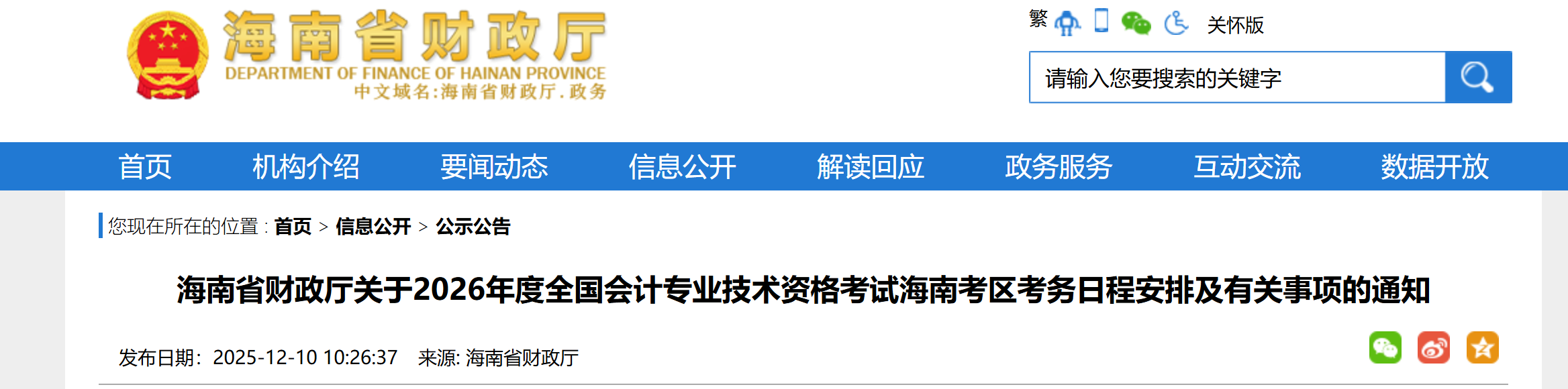 官方原文:海南省财政厅关于2026年度全国会计专业技术资格考试海南考区考务日程安排及有关事项的通知_公示公告_海南省财政厅